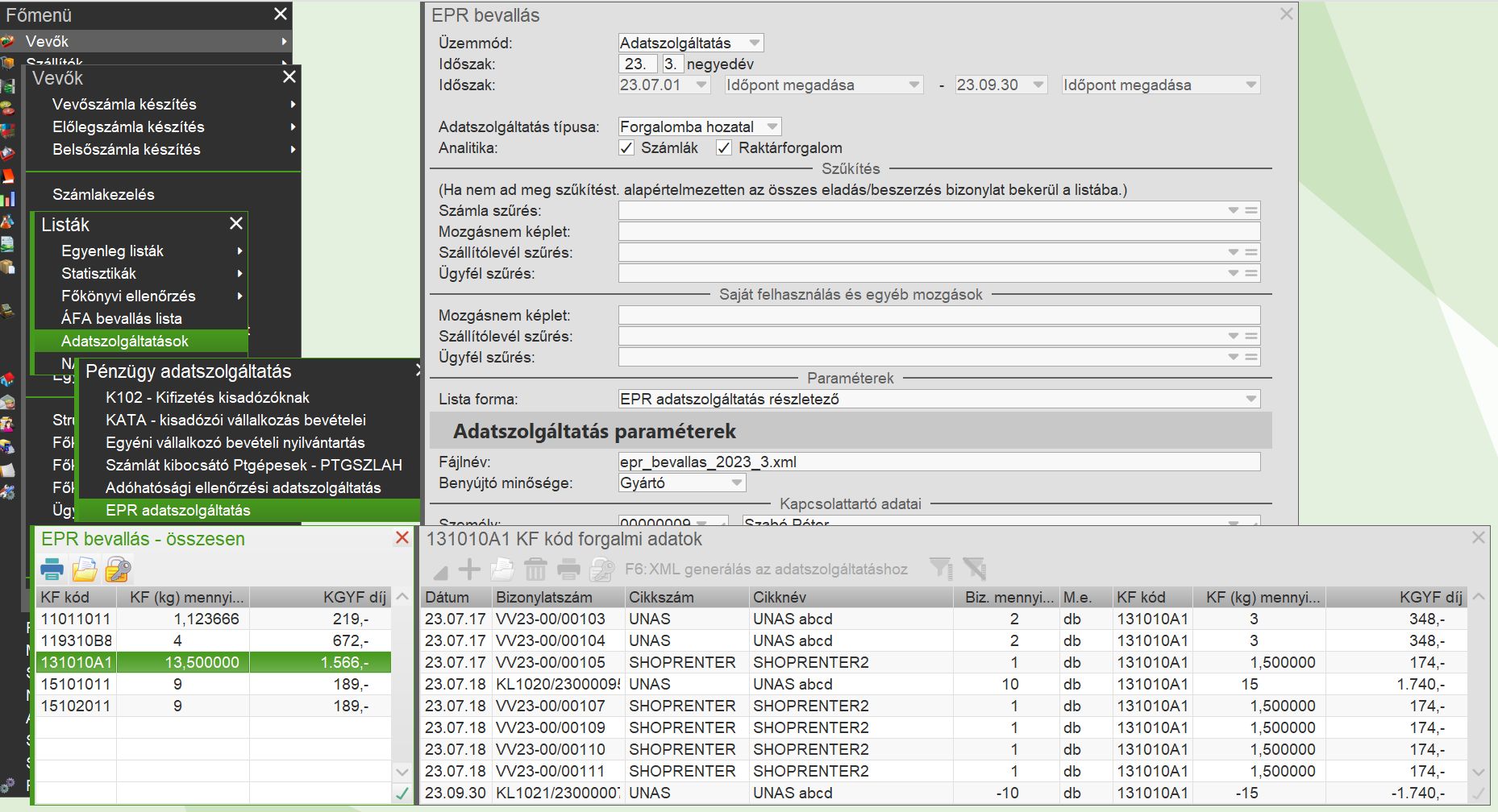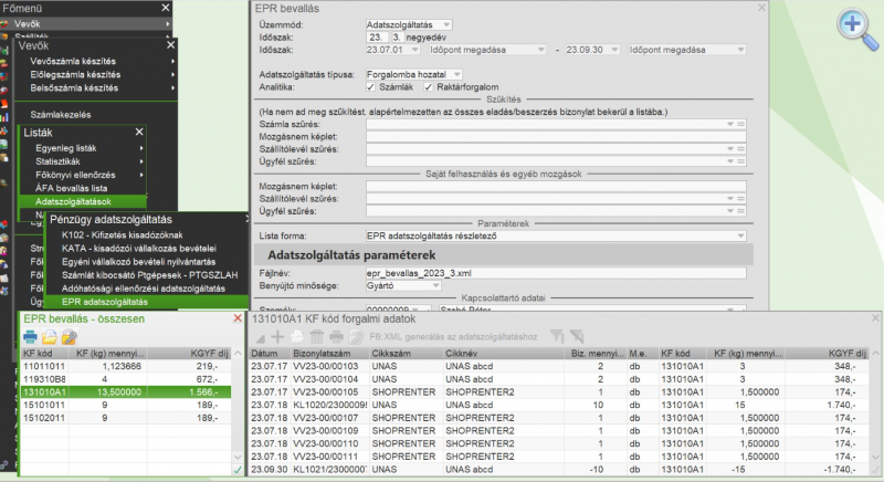 2023 július 1-jén lépett hatályba a Kiterjesztett gyártói felelősség rendszere (EPR), melynek első adatszolgáltatása a 2023-as év 3. negyedévére 2023. október 20-ig esedékes. Az adatszolgáltatás elkészítésének támogatásához létrehoztuk a Machinátorban az EPR bevallás funkciót. A funkcióval rugalmas felületen lekérdezhetők, listázhatók az adott időszakban keletkező EPR díjak, valamint a bevallást segítő adatszolgáltatás XML fájl is elkészíthető, amellyel az adatszolgáltatást kézi bevallás helyett a programból lekérve és az OKIRkapu felületére feltöltve is teljesíthető.
