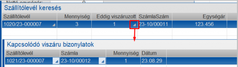 Az eladás bizonylat kiválasztása során látható, hogy történt-e korábban visszáruzás abból az eladásból.