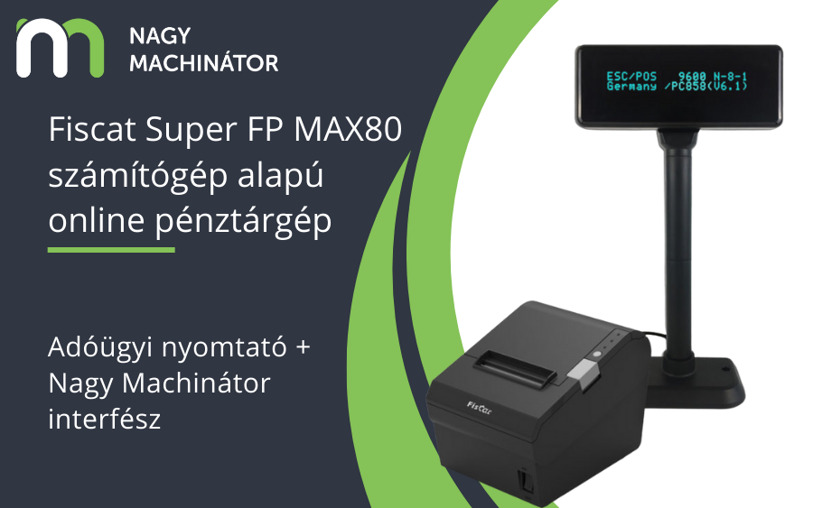A Fiscat MAX80 adóügyi nyomtató a Nagy Machinátor ügyviteli rendszerrel együtt vásárolva és a megfelelő szoftver-verzióval teljeskörű integrációt biztosít.