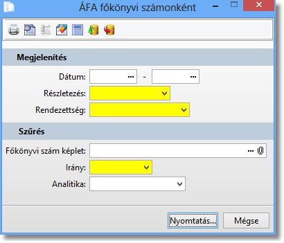 Funkció elérése menüszerkesztéskor: Adó / Általános forgalmi adó / Listák / Áfa főkönyvi számonként
