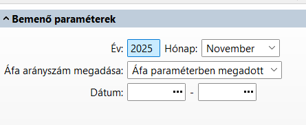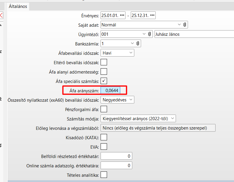 Az Áfa paraméterben meg kell adni az Áfa arányszámot a tárgyévre vonatkozó időszakra (az arányszám változás miatt, minden évben új időszakot kell felvenni). 01-11. hónapban ezzel az arányszámmal kell számolni.