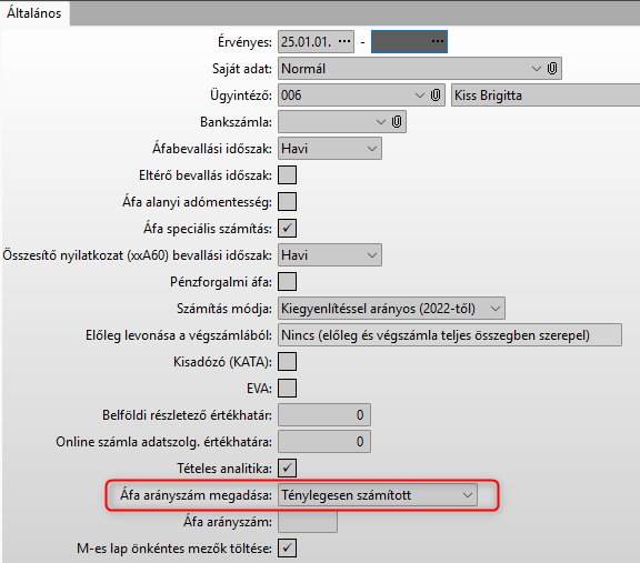 Az Áfa paraméterben az Áfa arányszám megadása mezőbe a Ténylegesen megadott típust kell választani.