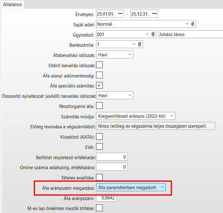 Az Áfa paraméterben meg kell adni az Áfa arányszámot a tárgyévre vonatkozó időszakra (az arányszám változás miatt, minden évben új időszakot kell felvenni).