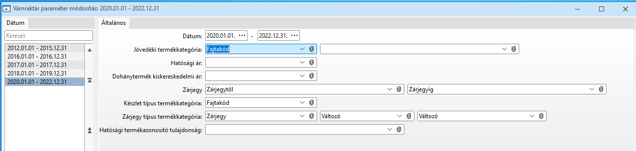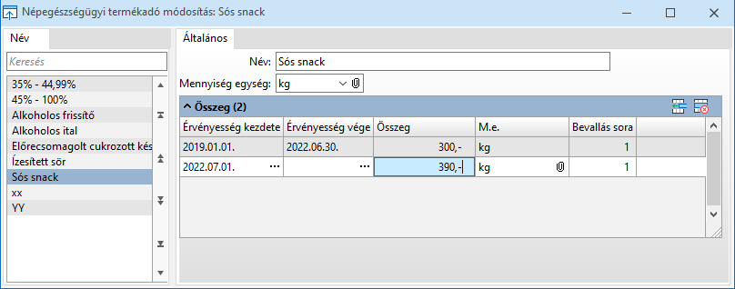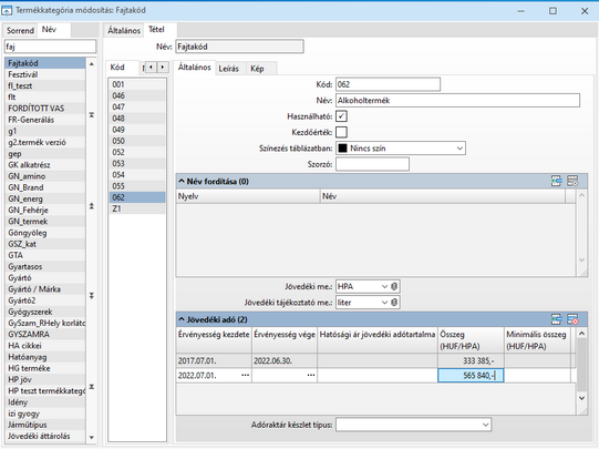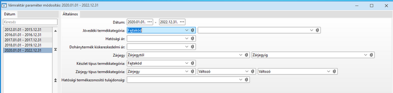 Ebben a termékkategóriában az adott fajtakódú terméknél tudjuk beállítani az új adómértéket. Tehát lezárjuk az előző értéket, és egy új sorban pedig felvesszük a megfelelő dátum tartománnyal az új adómértéket.