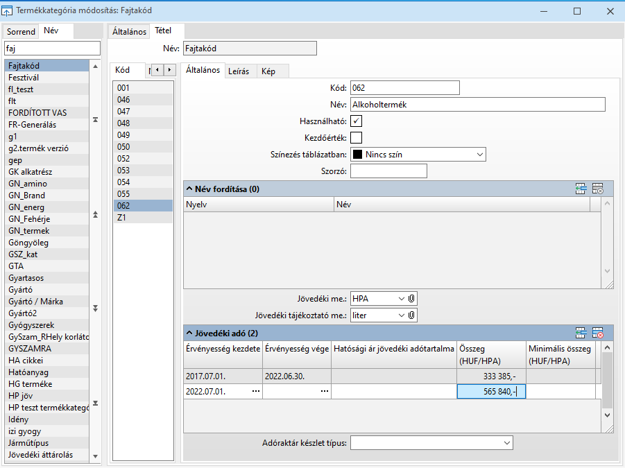 A Vámraktár paraméterben megadott Jövedéki termékkategóriában kell az adó mértékét megadni (a legtöbb ügyfelünknél ezt a kategóriát Fajtakódnak hívják).