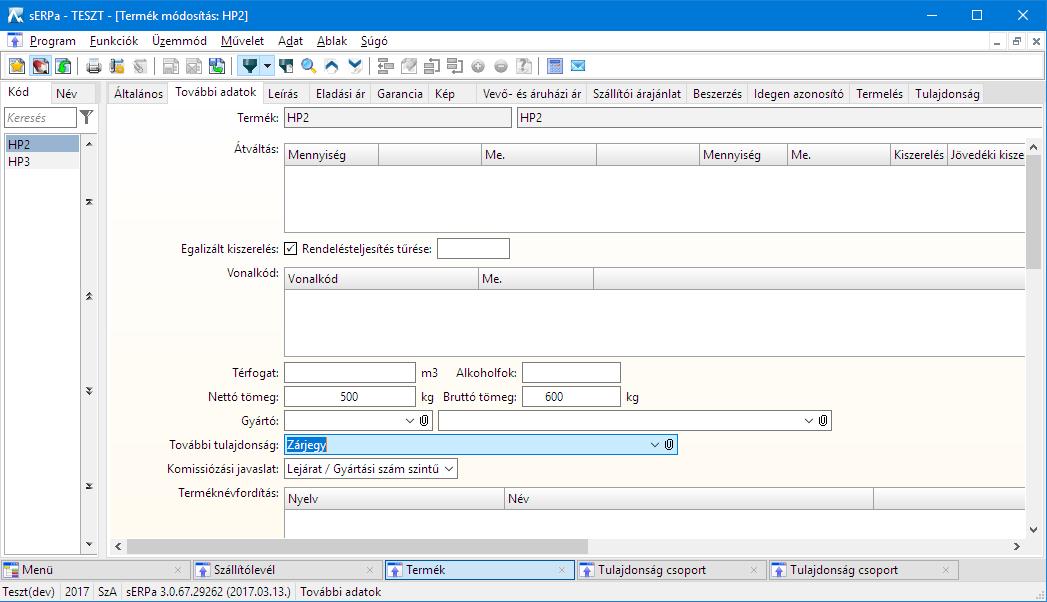 Ezt a tulajdonság csoportot fel kell venni a termékhez, hogy a szállítólevelekben megjelenjen.