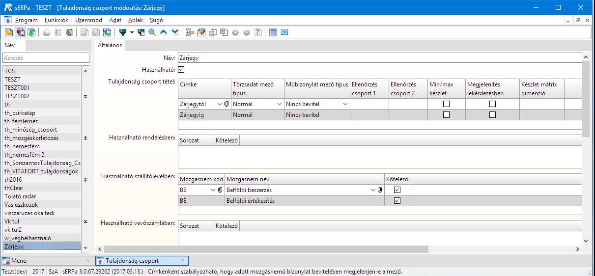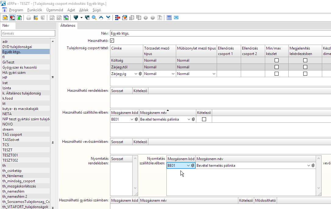 Fel kell venni egy tulajdonság csoportot, amelyben ez a két tulajdonság (is) szerepel. Itt a "Használható szállítólevélben" gridben meg kell adni azokat a mozgásnemeket amelyekben használni fogjuk. (Ez egy becsapós bevitel, a "Használható szállítólevélben" gridben felvettek csak a fent kiválasztott tulajdonságra vonatkoznak, tehát a Zárjegytől és Zárjegyig címkéhez is meg kell adni, hogy melyik szállítólevelekben használhatók.)