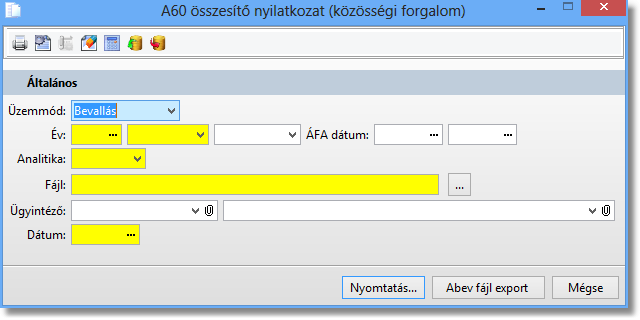 Az "Abev fájl export" után (ha az Analitika mentés figyelmeztetés menüparaméterrel nem tiltottuk ezt) egy figyelmeztető ablak jelenik meg: "A későbbi ellenőrizhetőség miatt érdemes a beadott bevallás analitikáját menteni." Az üzenet jóváhagyása után elindul az ÁNYK program a megfelelő nyomtatvány kitöltésével (ennek feltétele a xxA60 nyomtatványkitöltő program megléte).