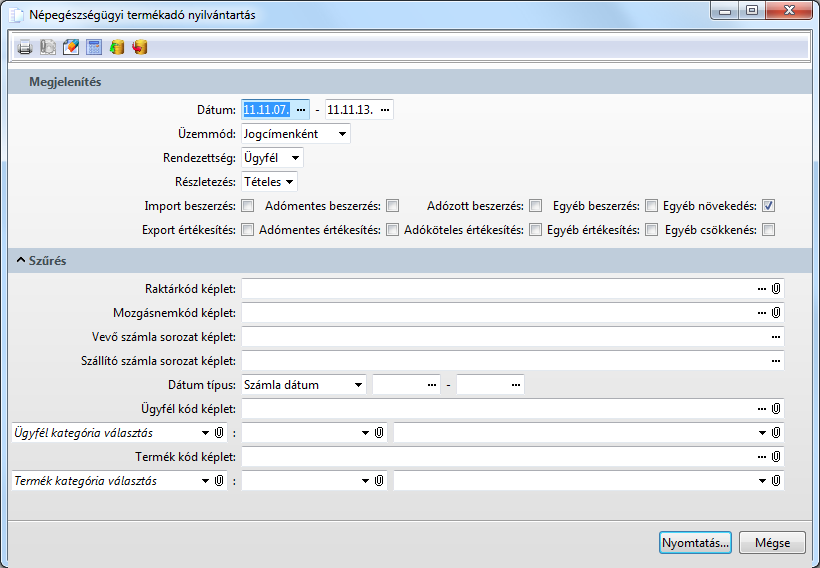 Funkció elérése menüszerkesztéskor: Adó / Népegészségügyi termékadó nyilvántartás lista