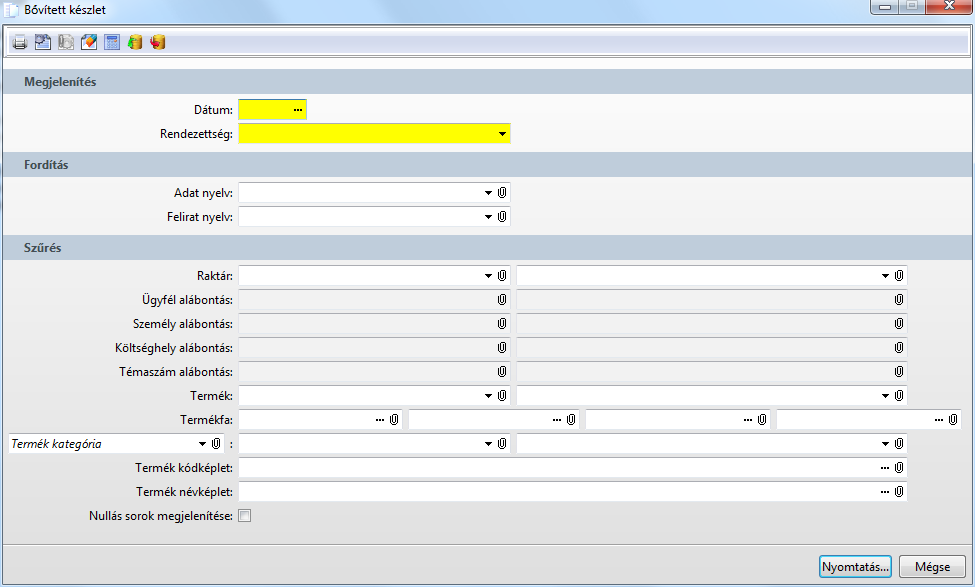Funkció elérése menüszerkesztéskor: Rendelés-nyilvántartás / Listák / Bővített készlet lista