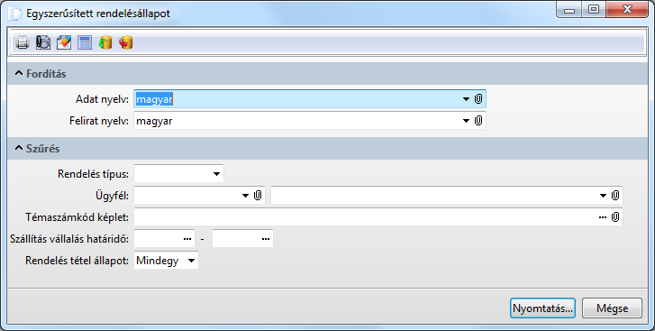 Funkció elérése menüszerkesztéskor: Rendelés-nyilvántartás / Listák / Egyszerűsített rendelés állapot lista
