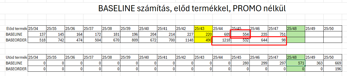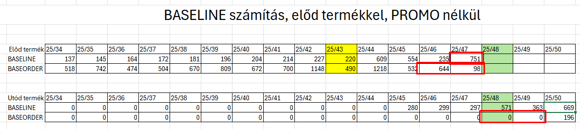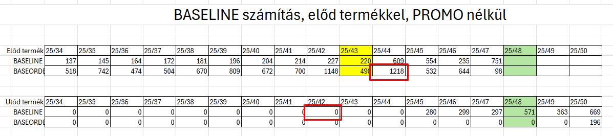 Az utóddá válás hetén az alábbiak szerint változik a számítási logika: 2. példa: a 25/48 hét BASELINE értékének számításakor a Bázis heti alapfogyásszint az előd termék 25/45. hetéből (hiszen épp ezen a héten érvényes már az utód termék), míg a BASEORD a 25/44-25/47 hetek átlagából számolja a program.