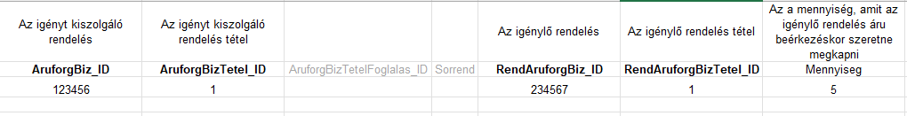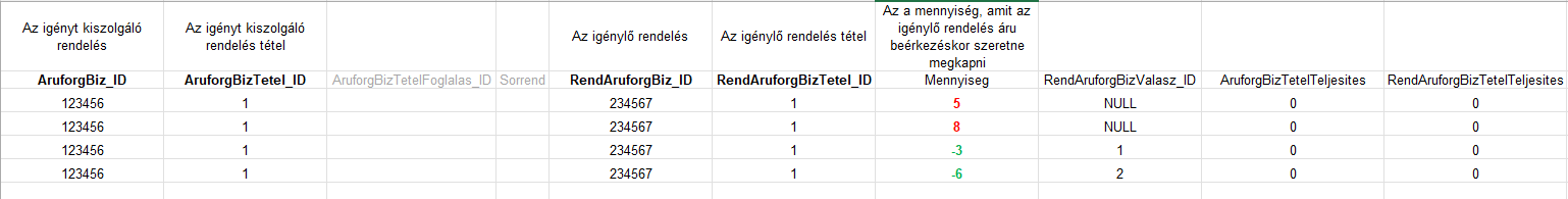 - RendAruforgBizValasz_ID: Annak a (diszponálás) rendelés válasznak az ID-jét jegyezzük fel, amelynek kapcsán az igénylő rendeléstétel az árut megkapta. Ennek következménye, hogy az igénylő rendeléseken az ilyen válaszok érinthetetlenek.