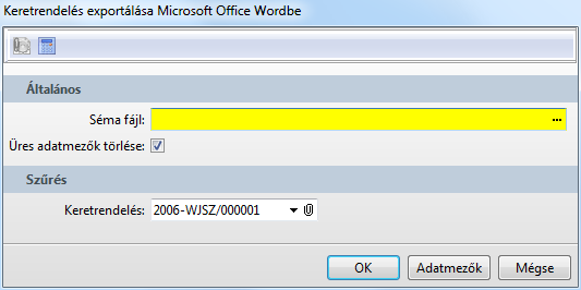A művelet elindításával a megjelenő Párbeszédablakban kiválasztott bizonylatszámú keretrendelés adatai kerülnek átadásra Word-be. A "Séma fájl" mezőbe beírt *.doc fájl által meghatározott módon történik az export. Az Adatmezők gomb a sémafájl egyszeri elkészítését segíti azzal, hogy megmutatja, hogy mely mezők milyen szintaxissal szerepelhetnek a sémában. Innen kimásolva a mezőket és beillesztve egy *-doc sablonfájlba, majd azt szövegekkel, szerkesztéssel, formázásokkal kiegészítve elkészíthető a nívós kinézetű fájl. Az üres adatmezők törlése pipa azt szabályozza, hogy azok a mezők, amelyek nem kapnak értéket a word-ben hogyan jelenjenek meg: «xxx» módon, azaz feltűnően látszik, hogy valami probléma van, mert olyan adat, amit vártunk nem került át, vagy üresen, azaz ne is látszódjon, hogy ott van egy adatmező. Azért nincs automatikus sablonfájl gyártására lehetőség, mert például a tétel táblázatban 32 oszlop lenne, amire nyilván nincs mindenkinek szüksége (és nem is fér ki), hanem ebből csak annyira, ami a működésük szerint szükséges. A táblázatban megjelenő tételek esetén fontos a megfelelő szintaxis használata. A rendszer a táblázatot a bal alsó cellába a kacsacsőrök közé beírásra kerül szövegből ismeri fel. Sablonfile-al kapcsolatos további információk. Fontos további tudnivaló, hogy a doc fájlban a táblázatban üres sorok ne legyenek!