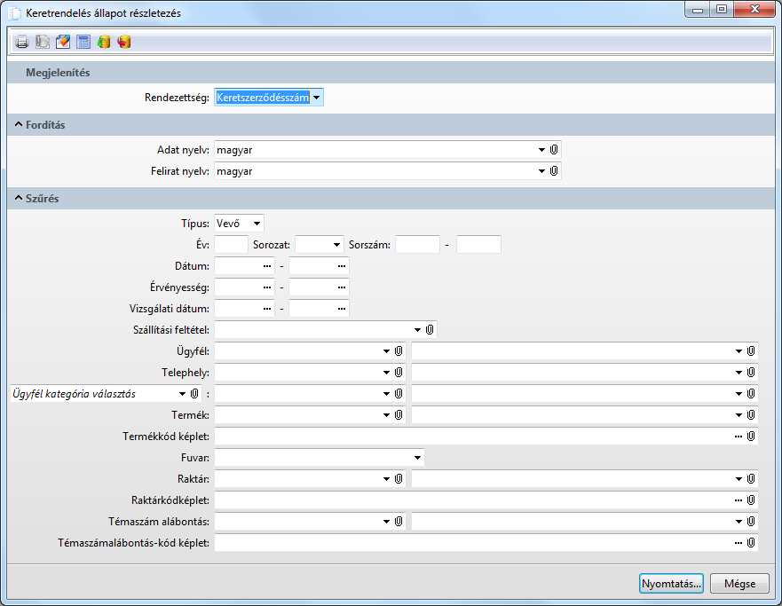 Funkció elérése menüszerkesztéskor: Rendelés-nyilvántartás / Listák / Keretrendelés állapot részletezés