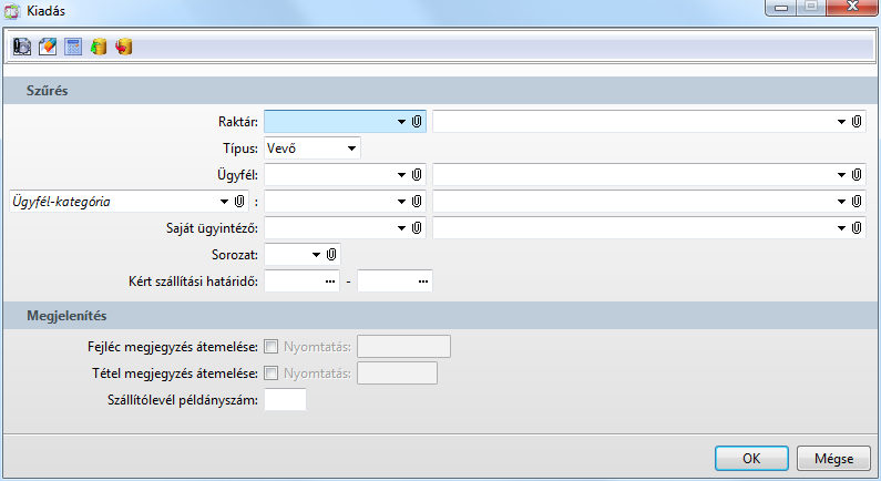 A raktár beviteli mező értékének rögzítésére szolgál - megadása esetén csak az ebből a raktárból szállítható megrendeléseket lehet kiadni. |