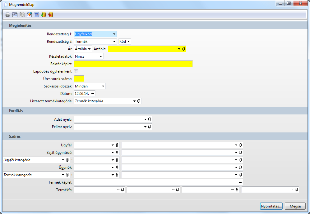 Funkció elérése menüszerkesztéskor: Rendelés-nyilvántartás / Listák / Megrendelőlap