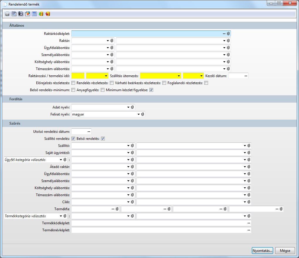 Funkció elérése menüszerkesztéskor: Rendelés-nyilvántartás / Listák / Rendelendő termék lista