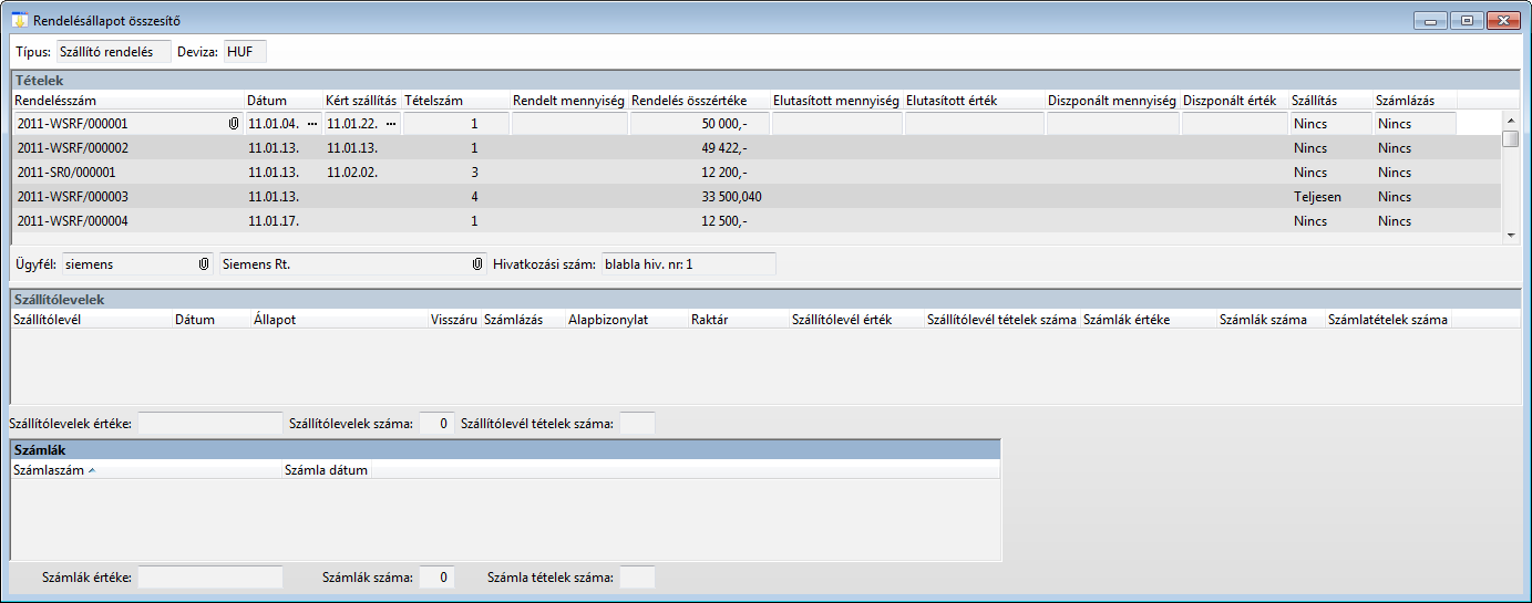 A lekérdezés a megadott szűrési feltételeknek megfelelően összesíti rendelésenként a rendelt, a diszponált és az elutasított válaszokat, valamint részletezi a rendelés szállításait és számláit.
