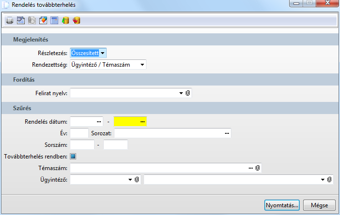 Funkció elérése menüszerkesztéskor: Rendelés-nyilvántartás / Listák / Rendelés továbbterhelés lista