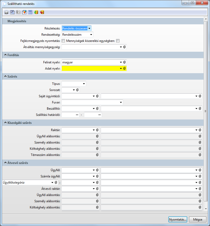 Funkció elérése menüszerkesztéskor: Rendelés-nyilvántartás / Listák / Szállítható rendelés lista
