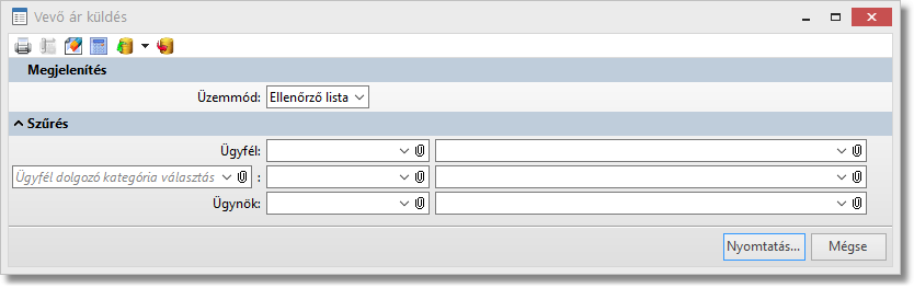 Funkció elérése menüszerkesztéskor: Rendelés-nyilvántartás / Listák / Vevő ár küldés