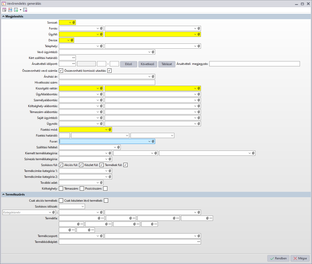 Raktár beviteli mező értékének rögzítésére szolgál - megadása esetén csak az ebből a raktárból szállítandó megrendeléseket lehet diszponálni. Ügyfélkód / Telephelykód