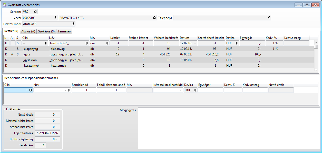 A Rendelendő és diszponálandó termékek sávban (ezt tekinthetjük bevásárló kosárnak, amibe virtuálisan betesszük a terméket) a kiválasztott termékek szerepelnek, módosítható rendelendő, diszponálandó mennyiséggel, kért szállítási határidővel, deviza,egységárral, kedvezménnyel, nettó értékkel, megjegyzés szabályozással. Árajánláskor csak azok az ár mezők módosulnak, amik értéke kézi beavatkozással nem lett eltérítve az eredeti ajánlástól. Példa: a terméket kiválasztjuk, mennyiség 1db, nettó egység 500Ft, engedmény % mező üres. Ha a felhasználó az egységárat átírja 400 Ft-ra, majd a mennyiséget módosítja 10db-ra, melyre már jár 5% engedmény, akkor az egységár 400Ft-on marad (kézi beavatkozással eltérített, ezért már nem módosuló érték) de az engedmény % mezőbe bekerül az 5% (kézzel el nem térített mező)