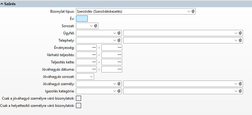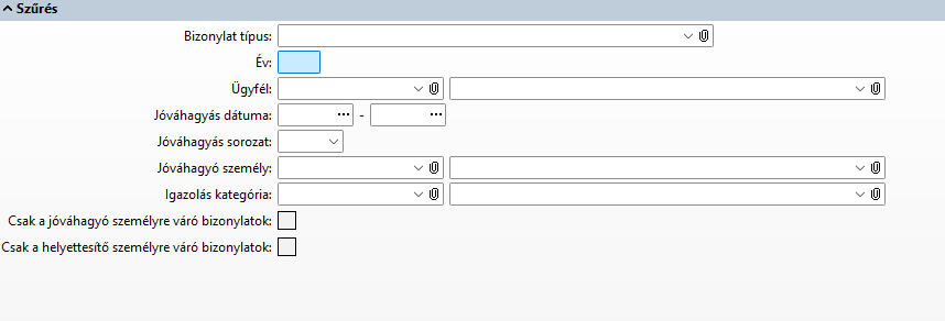 A jóváhagyandó bizonylat típusát adja meg. A kiválasztott típus alapján további szűrőmezők jelennek meg. |
