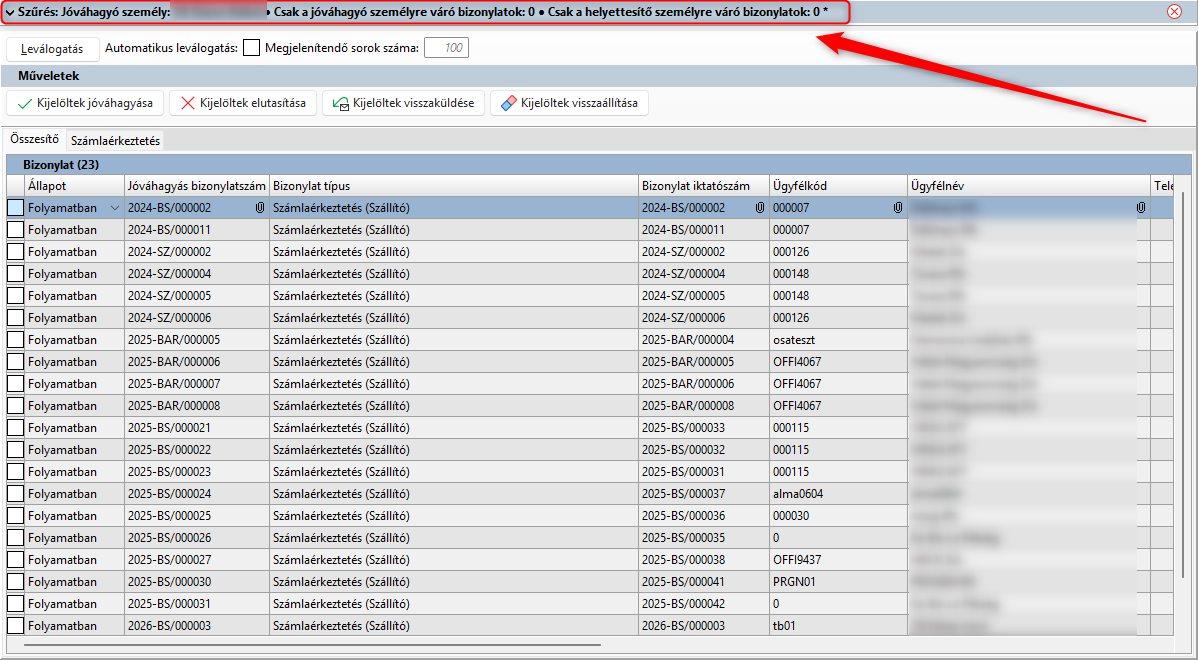 Bekapcsolva csak az aktuális jóváhagyó személyre váró bizonylatok jelennek meg. |