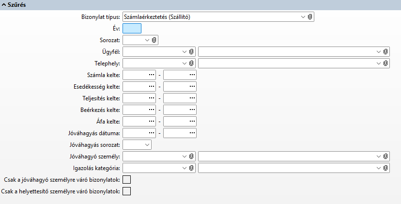 A Bizonylat típus mező értékétől függően az alábbi további szűrők érhetők el.