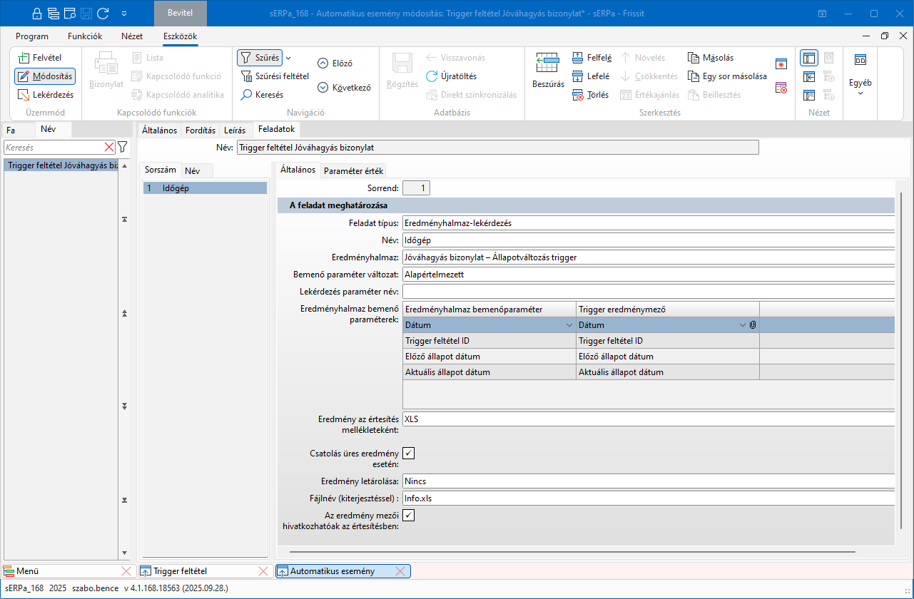 Itt a fent említett Jóváhagyás bizonylat - Állapot változás trigger eredményhalmazt adjuk meg, hogy a jelen beállítás szerint egy excel táblázatban mellékletként kapjuk meg a beállított eredményhalmaz lekérdezés eredményét. Itt látható, hogy a Trigger eredménymezői az Eredményhalmaz bemenő paramétereivel van összekötve, azok alapján fut le az eredményhalmaz-lekérdezés. Lehetőség van azt is megadni, hogy a generált excelnek mi legyen a neve.