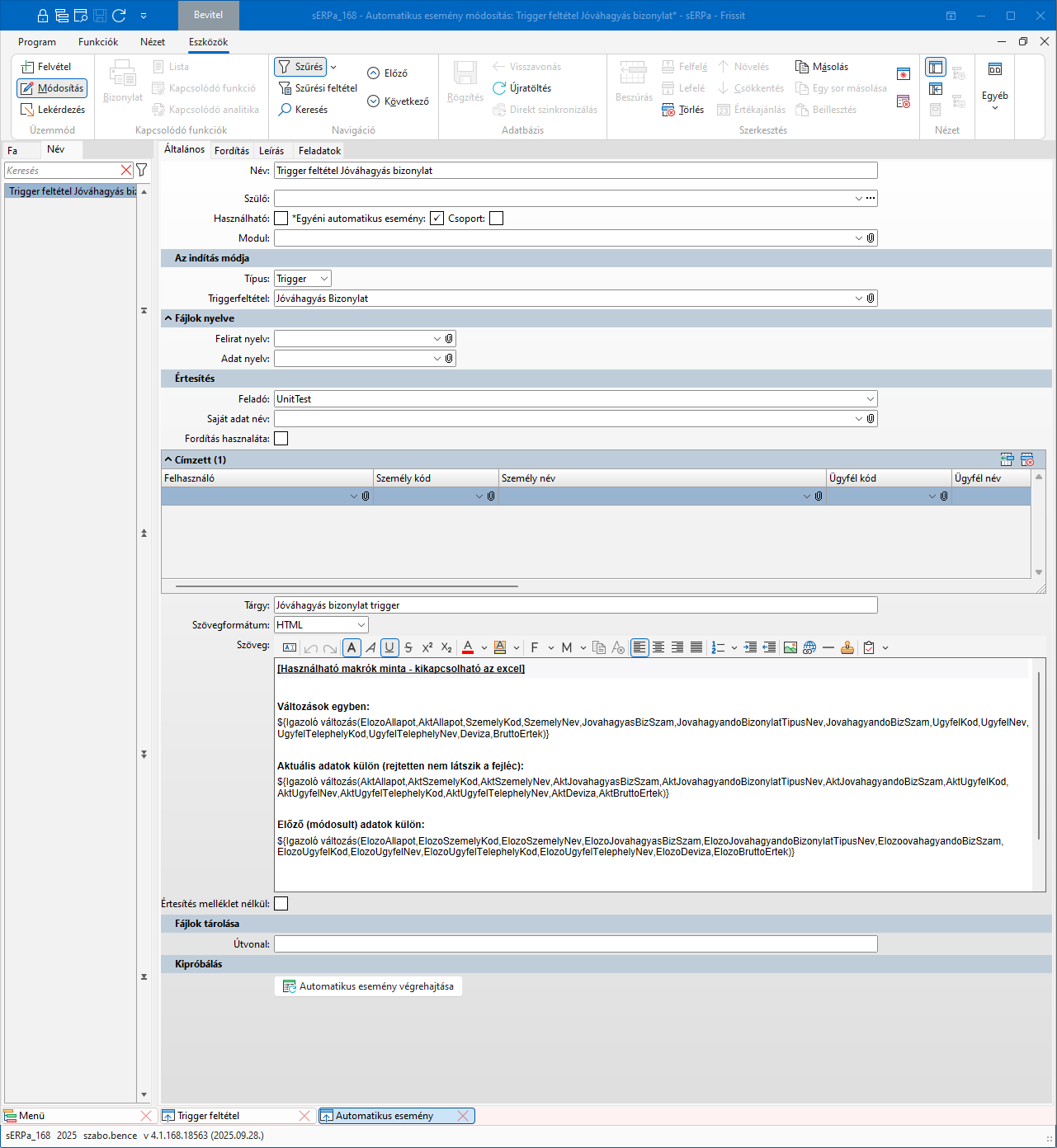A beállítások elvégzése után, már a paraméterezések szerint működik az automatikus esemény.