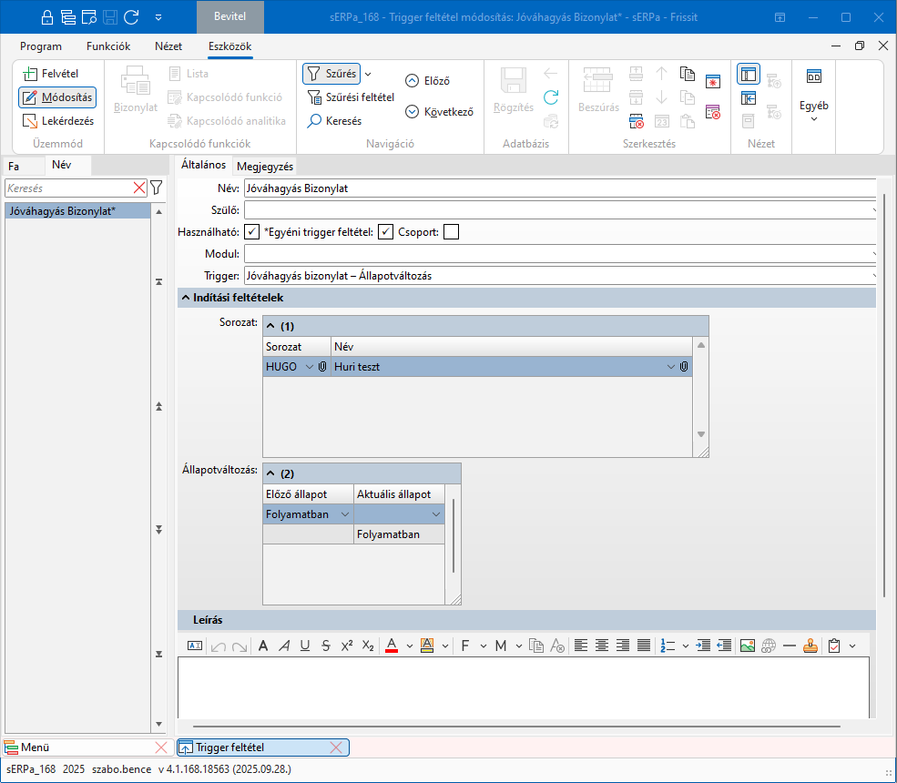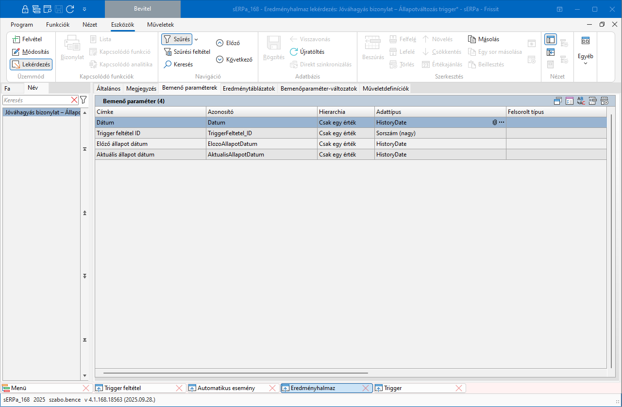 Amennyiben egy excel mellékleteként szeretnénk a változás eredményét látni, szükség lesz egy Eredményhalmazra. Ennek az eredményhalmaznak a bemenő paramétereinek szerepelnie kell a Trigger eredménymezői között. Az eredményben pedig létrehozhatjuk azt az eredményt, amit szeretnénk az excelben látni.