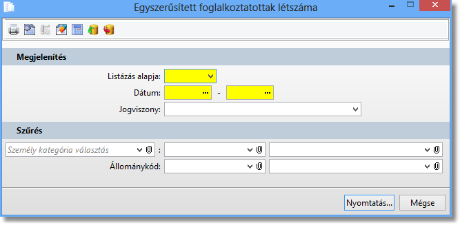 Funkció elérése menüszerkesztéskor: Bérszámfejtés / Listák év közben / Egyszerűsített foglalkoztatottak létszáma