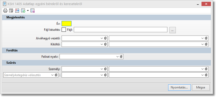 Funkció elérése menüszerkesztéskor: Bérszámfejtés \ Feladatok év közben \ KSH 1405 Adatlap egyéni bérekről és keresetekről
