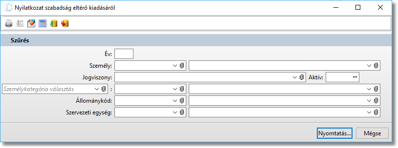 Funkció elérése menüszerkesztéskor: Bérszámfejtés / Listák év közben / Nyilatkozat éves szabadság eltérő kiadásáról