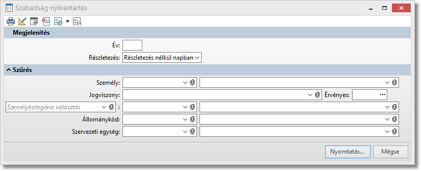 Funkció elérése menüszerkesztéskor: Bérszámfejtés / Listák év közben / Szabadság-nyilvántartás