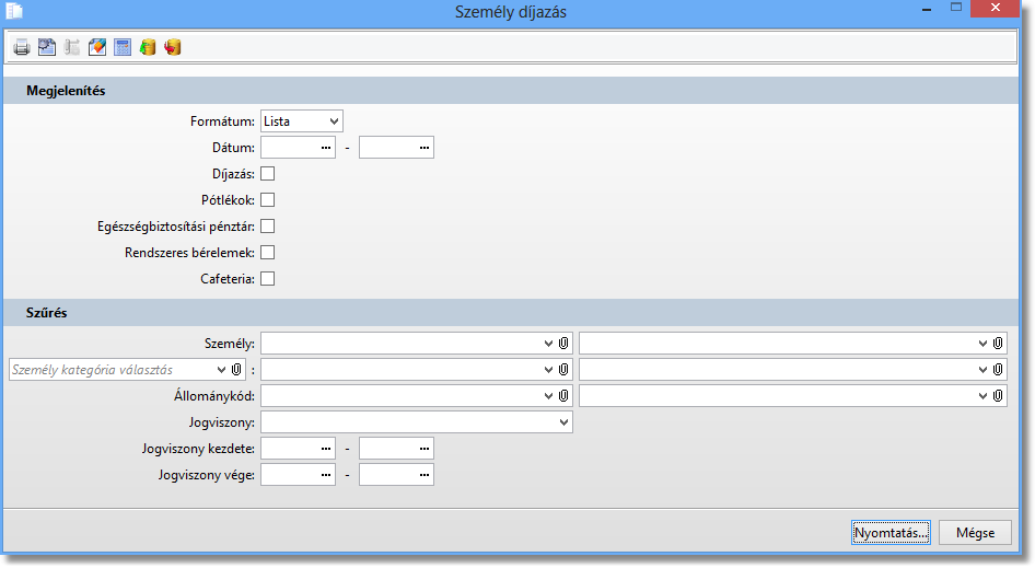 A funkció a személyek (jogviszonyonkénti) díjazásainak, pótlékainak, cafeteria adatainak listázására szolgál.