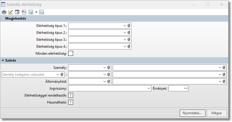 Funkció elérése menüszerkesztéskor: Bérszámfejtés / Listák év közben / Személy elérhetőség