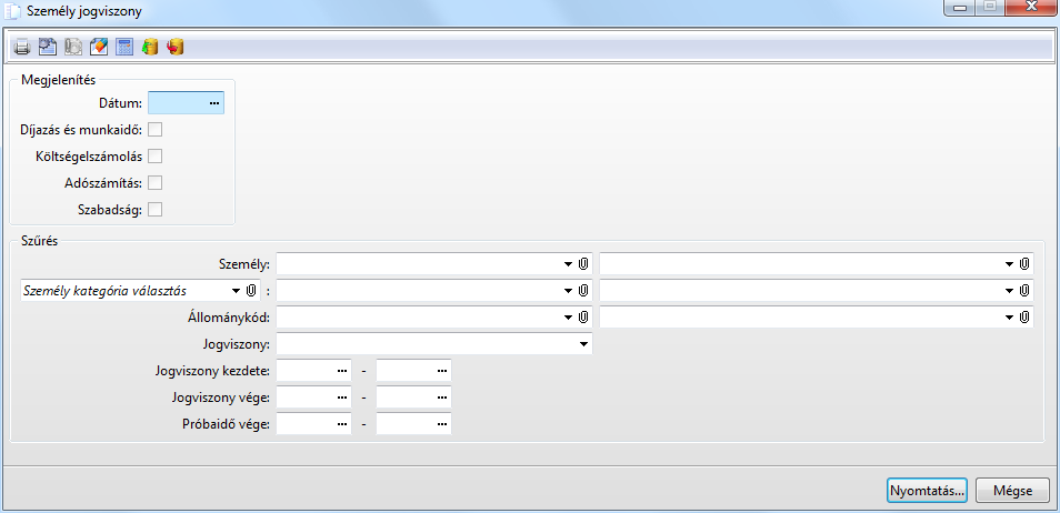 Funkció elérése menüszerkesztéskor: Bérszámfejtés / Listák év közben / Személy jogviszony
