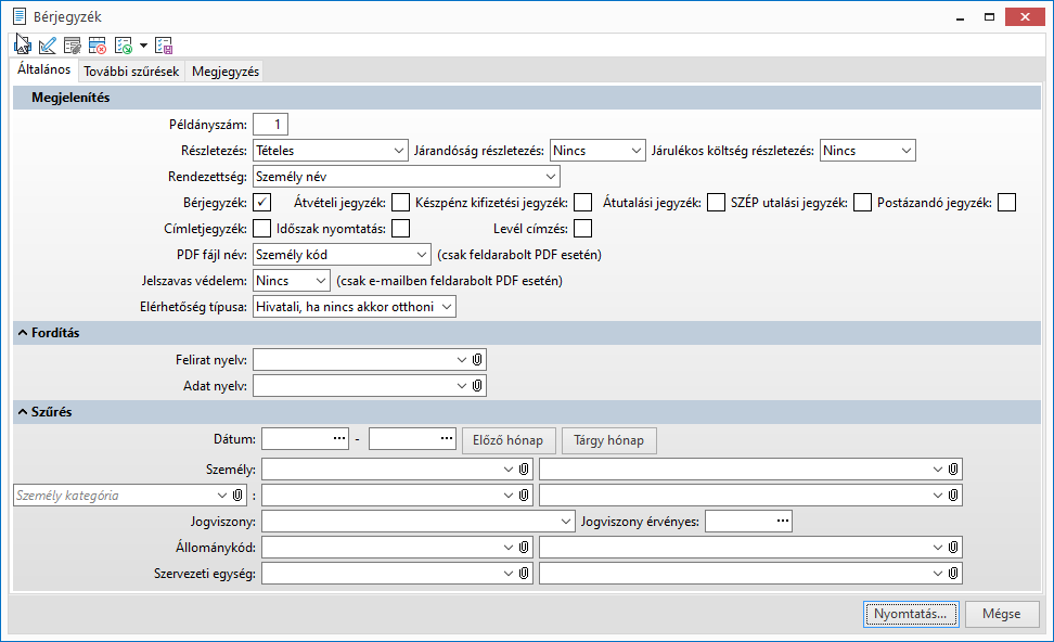 Havi bontásban a dolgozók bérjegyzékének nyomtatására szolgáló funkció, amelyen a megadott időszakra vonatkozó, a dolgozó számfejtési adatok kerülnek megjelenítésre.