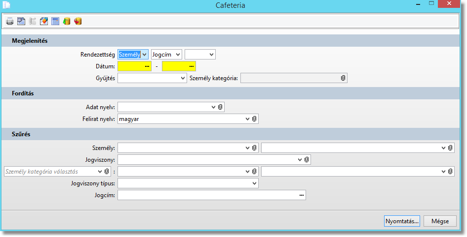 Funkció elérése menüszerkesztéskor: Bérszámfejtés / Listák év közben / Cafeteria