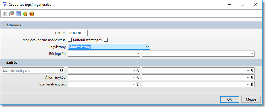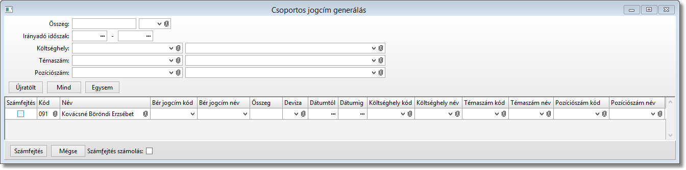 Funkció elérése menüszerkesztéskor: Bérszámfejtés / Csoportos jogcím generálás