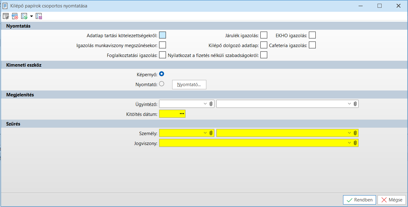 Funkció elérése menüszerkesztéskor: Bérszámfejtés / Listák kilépéskor / Kilépő papírok csoportos nyomtatása