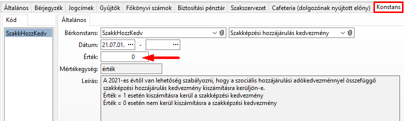 Új konstanst hoztunk létre "Szakképzési hozz. kedv. szocho kedvezmény alapig" néven, mely a Bérszámfejtés paraméter Konstans fülén átállítható. A konstans alapértelmezett beállítása szerint a szocho kedvezmények mellett csak akkor számolunk szakképzési kedvezményt, ha a hónapra vonatkozóan a dolgozó juttatása nem haladja meg a szociális hozzájárulás adókedvezmény maximális alapját, pl. Munkaerőpiacra lépők első két év kedvezménye esetében a minimálbért.