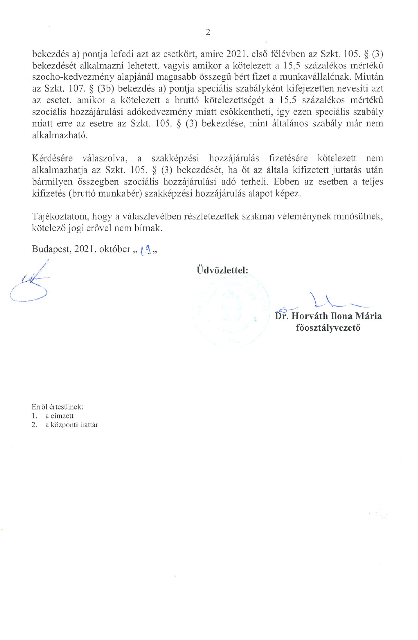 A fentiek tehát azt jelentik, ha a kötelezett nem juttat több jövedelmet a munkavállalónak, mint a 15,5 százalékos mértékű szociális hozzájárulási adókedvezmény alapjaként figyelembe vehető munkabér összege, akkor továbbra is az Szkt. 105. § (3) bekezdése alkalmazandó. Ez igaz mind a 2021 első, mind a 2021 második félévére. Az Szkt. 105. § (3) bekezdése alkalmazásának nem feltétele, hogy a kötelezett szakképzési munkaszerződés, hallgatói munkaszerződés, együttműködési megállapodás alapján képzést folytasson.