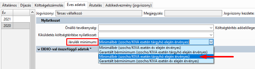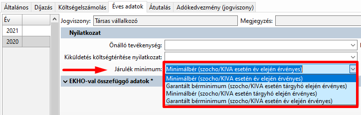 A programban eddig is lehetőséget biztosítottunk CSED esetében a jogszabálytól eltérő alkalmazásra. Azaz volt lehetőség beállítani, hogy az alapértelmezéstől eltérően ne kerüljön kiszámításra CSED-en lévő dolgozók esetében a minimum járulékalap. 2021. január 1-től az alapértelmezett beállítást módosítottuk, 2021-ben már nem számol a program CSED-en lévő személyek esetében minimum járulékot.