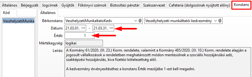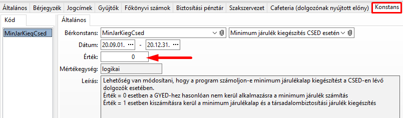 Amennyiben szükséges a 2020. évi hónapok esetében a 2008-as bevallás önellenőrzése, akkor kérjük a "Minimum járulék kiegészítés CSED esetén" elnevezésű bér konstanst a 2020-as évre vonatkozó dátum tartománnyal vegyék fel 0-s értékkel, az érintett számfejtéseket számfejtsék újra, és önellenőrizzék a bevallást.