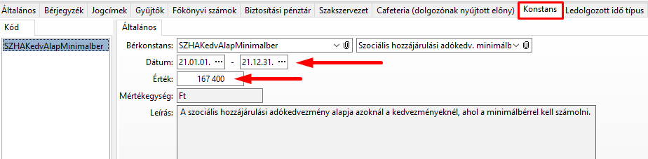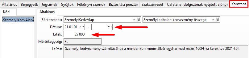 A Bérszámfejtés paraméterben a Konstans fülön a "Személyi adóalap kedvezmény összege" elnevezésű bér konstans felvételével, tetszőleges dátum és összeg megadásával lehetőség van az alapértelmezést felülbírálni: